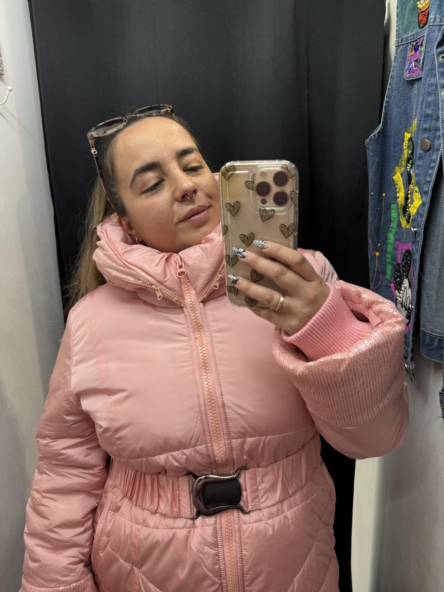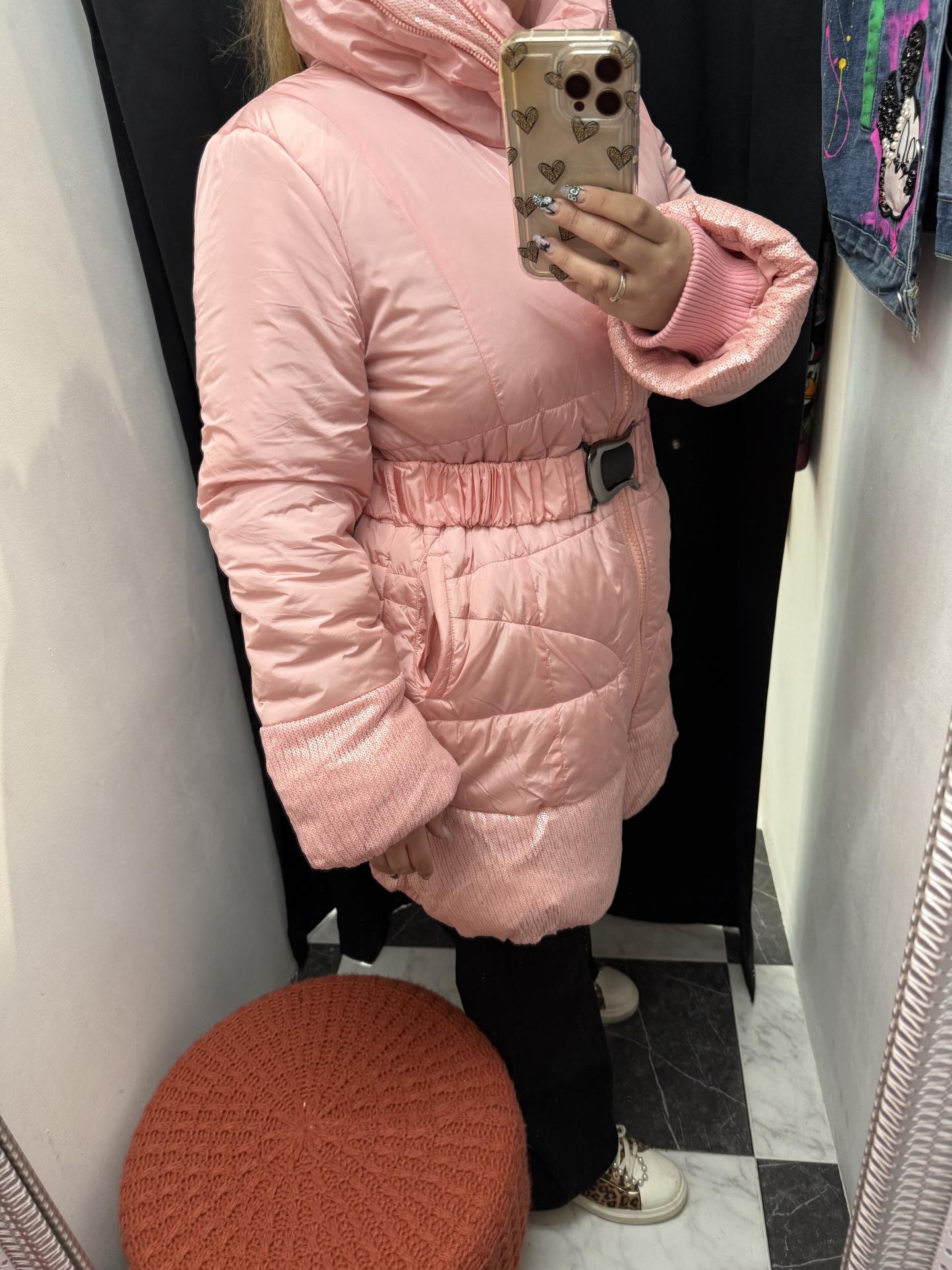 Abrigo rosa con cremallera y cinturón
